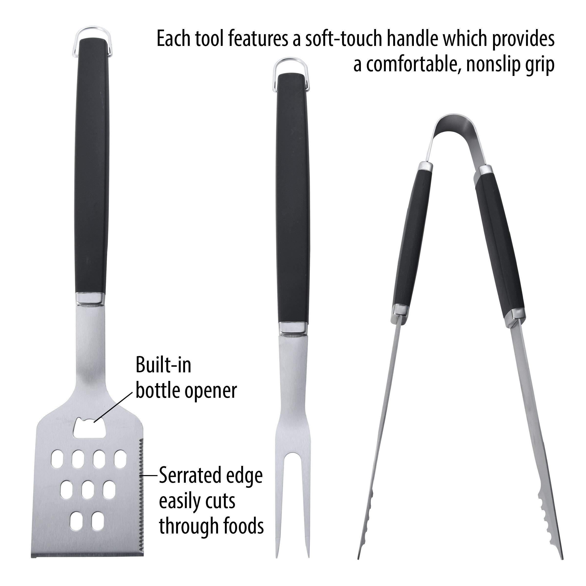 - 3 ESSENTIAL BARBECUE TOOLS: stainless steel tools with plastic handles including a pierced turner, tongs, and meat fork