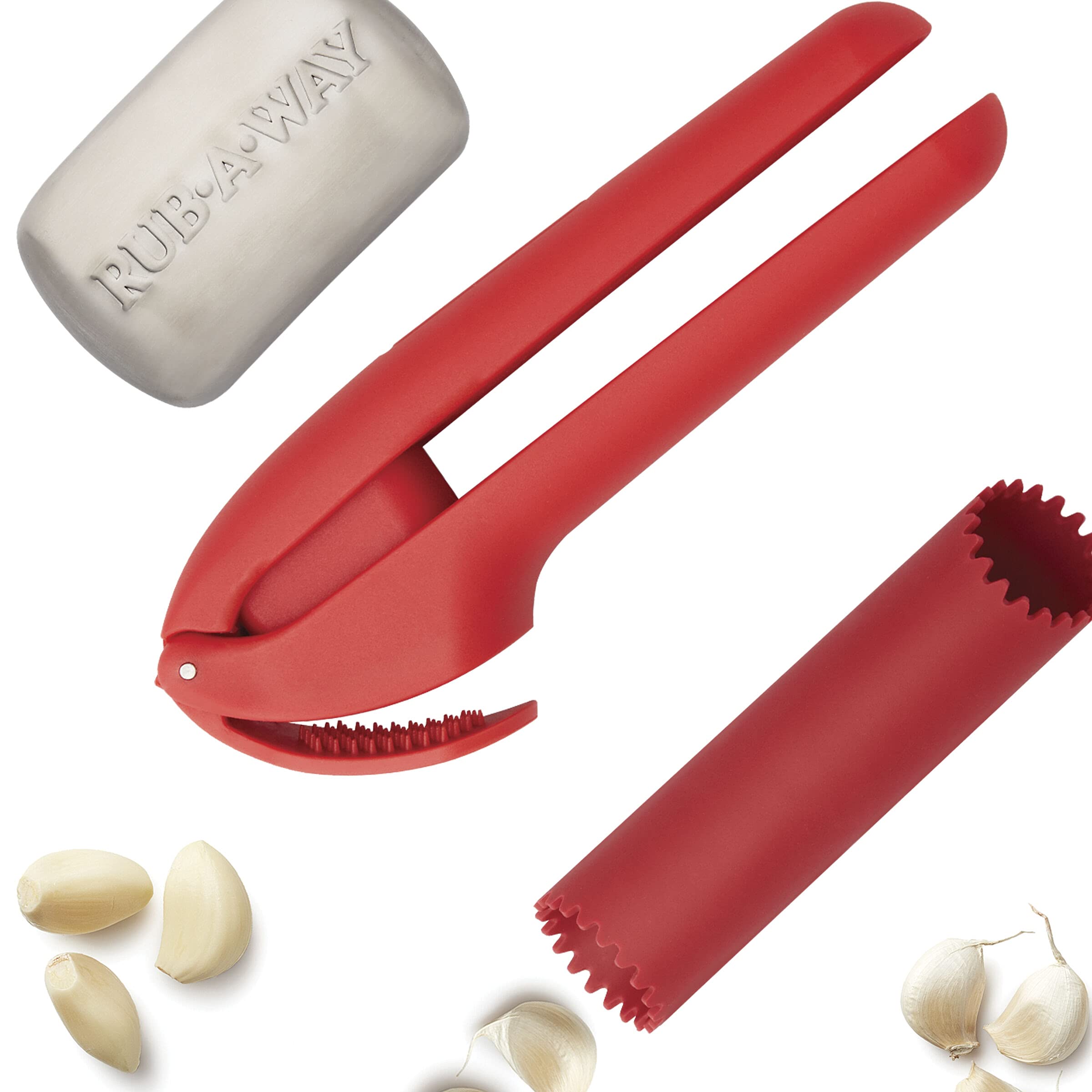 - SET INCLUDES: a garlic press, garlic peeler, and rub-a-way bar