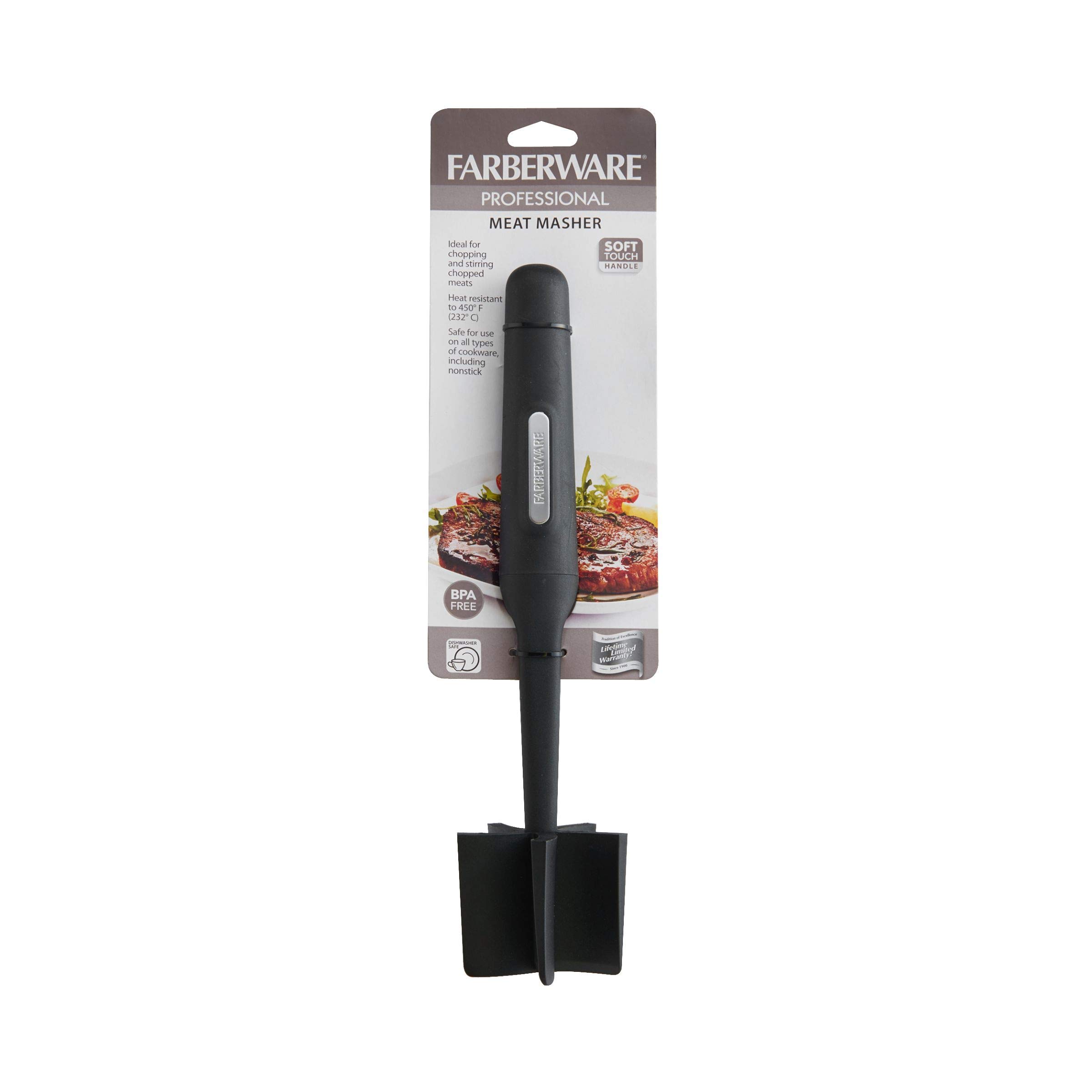 Farberware Professional Soft Handled Meat Masher Chopper Smasher Ground Beef, Turkey, Hamburger and more, 5-Blade Beveled Heavy-Duty Heat Resistant Nylon Safe for Non-stick Cookware, 11 Inch, Black